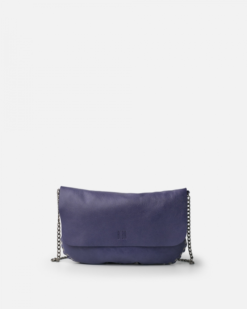 Sheephide shoulder bag. Decorative rivets around the edge of the bag. Adjustable leather and chain shoulder strap. Flap and zipper closure. Internal pocket. No lining.