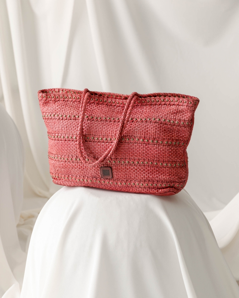 Large braided cowhide shopping bag. Decorative studs throughout the bag. Internal pocket. No lining. No closure system.